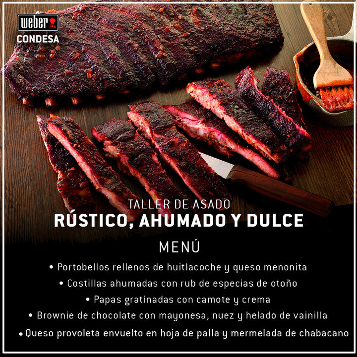 Vive una noche de asado donde aprenderás tips de asadores, cómo preparar los platillos del menú, utilizar los asadores Weber y pasar una noche agradable de asado con la guía del Chef.