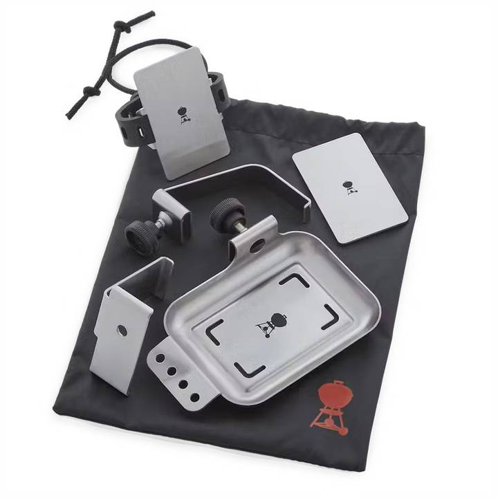 Mantén tu Weber Connect Smart Grilling a tu lado mientras parrillas. Con un montaje sencillo, el kit de montaje se esambla facilmente a los asadores de carbón, ahumadores y asadores de gas sujetando de forma segura el Weber Connect durante sus asados. El kit también incluye una bolsa para mantener juntas las piezas del kit al guardarlas.